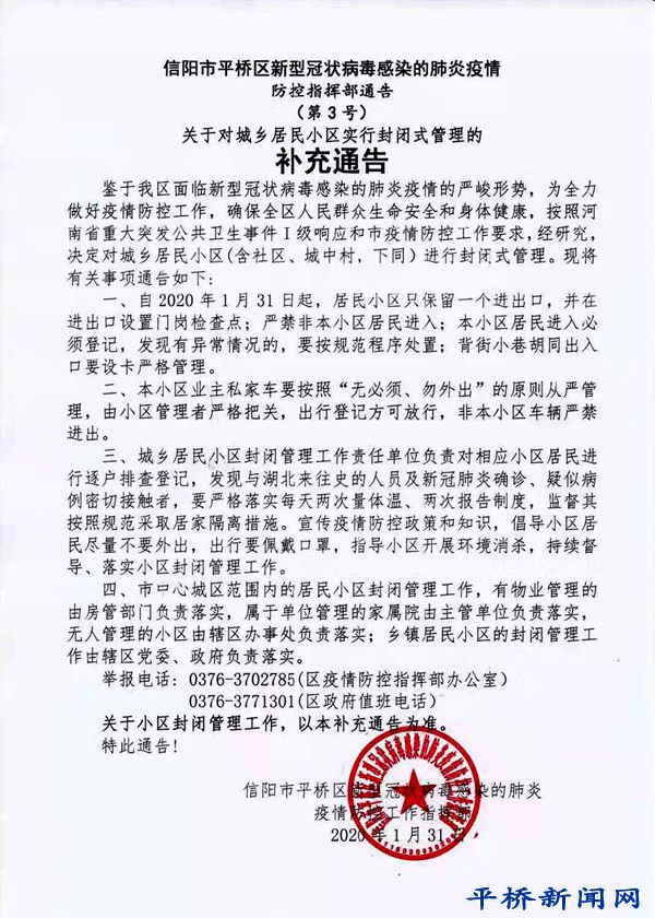 2020-01-31 來源:信陽市平橋區(qū)新型冠狀病毒感染的肺炎疫情 防控工作指揮部