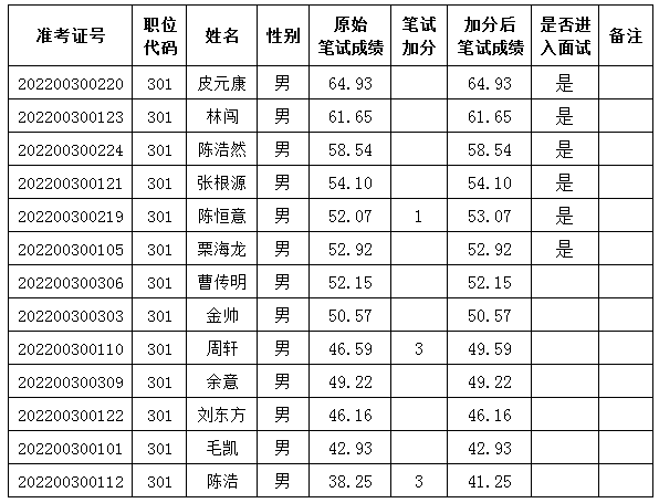 該職位筆試成績及進入面試人員名單以更正后為準,現(xiàn)將更正后的筆試成績及進入面試人員名單予以公告。
