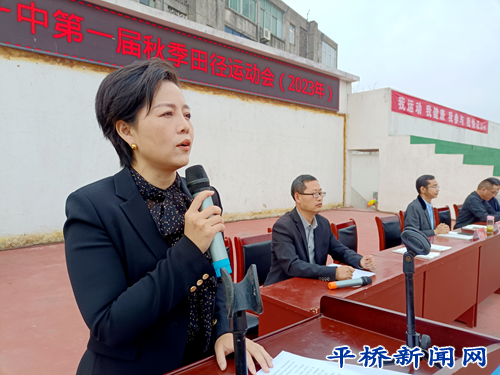 平橋區(qū)教體局副局長(zhǎng)謝玲玲代表區(qū)教體局對(duì)本次運(yùn)動(dòng)會(huì)的召開(kāi)表示熱烈的祝賀!對(duì)精心籌備本屆運(yùn)動(dòng)會(huì)的組委會(huì)工作人員表示誠(chéng)摯的謝意,向全體裁判員、運(yùn)動(dòng)員致以親切的問(wèn)候和崇高的敬意!她寄語(yǔ)一中學(xué)子,21世紀(jì)是知識(shí)的世紀(jì),是技能的世紀(jì),更是競(jìng)爭(zhēng)的世紀(jì),必須擁有良好的心理素質(zhì)、優(yōu)秀的人格素質(zhì)、完善的體能素質(zhì)。期望同學(xué)們?cè)谶\(yùn)動(dòng)舞臺(tái)上盡情體驗(yàn)競(jìng)賽的魅力,全面詮釋體育精神,頑強(qiáng)拼搏,超越自我,充分展示昂揚(yáng)向上的青春活力、奮發(fā)進(jìn)取的精神風(fēng)貌和全面發(fā)展的優(yōu)良素質(zhì)!期望全體裁判員嚴(yán)守規(guī)程,公正裁判,齊心協(xié)力,把運(yùn)動(dòng)會(huì)辦成一個(gè)“禮貌、熱烈、精彩、圓滿(mǎn)”的盛會(huì),為推動(dòng)學(xué)校素質(zhì)教育的開(kāi)展、提高學(xué)校的體育水平作出新的貢獻(xiàn)!